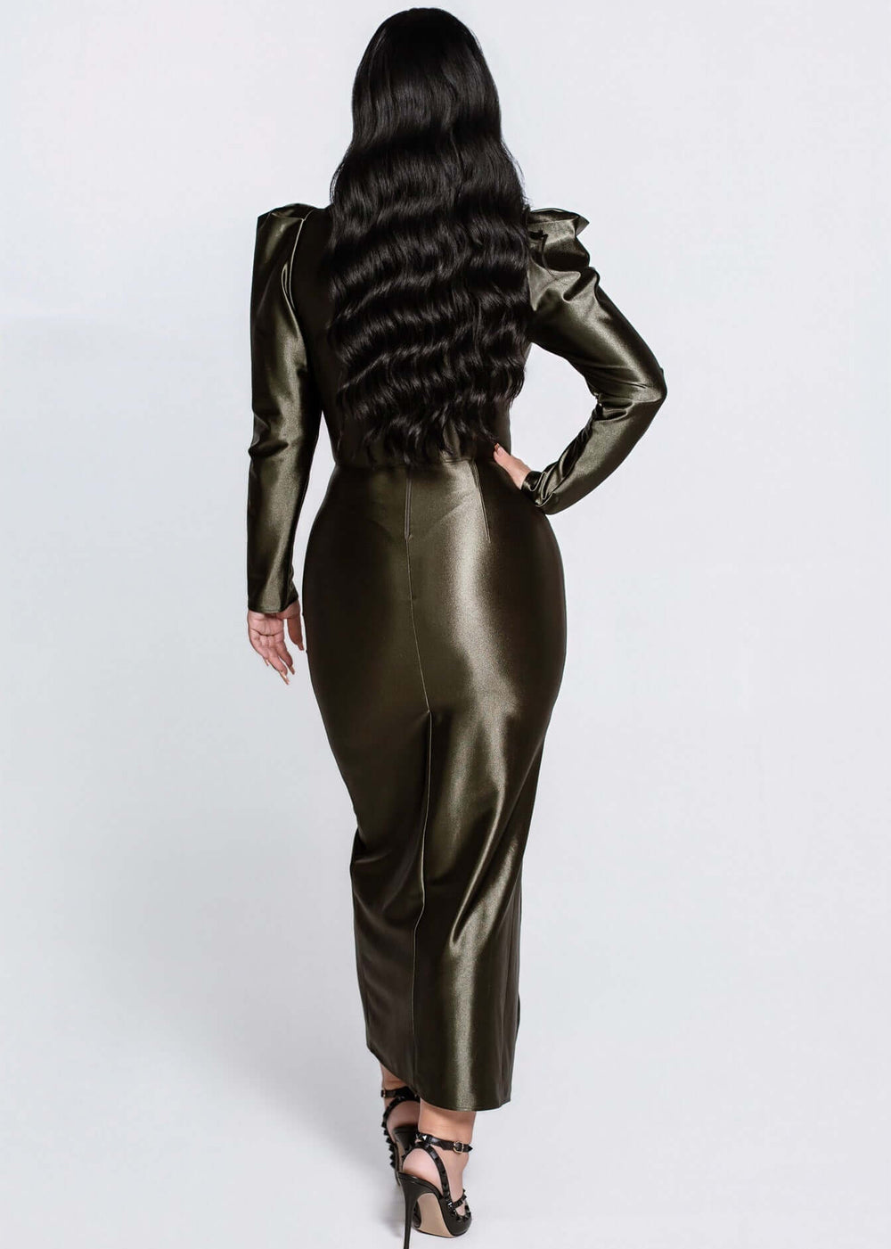 SIA Luneva este definiția rafinamentului contemporan. Realizată din lycra densă, cu o textură fină și elasticitate subtilă, urmărește perfect liniile corpului și creează un efect sculptural irezistibil. Croiala conică, cu slit adânc și umeri ușor structurați, conturează o siluetă impunătoare, feminină, care atrage toate privirile.