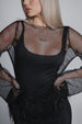 Mâneci evazate, decorate cu pene luxoase, adaugă dramatism, în timp lungimea evidentiaza piciorele.