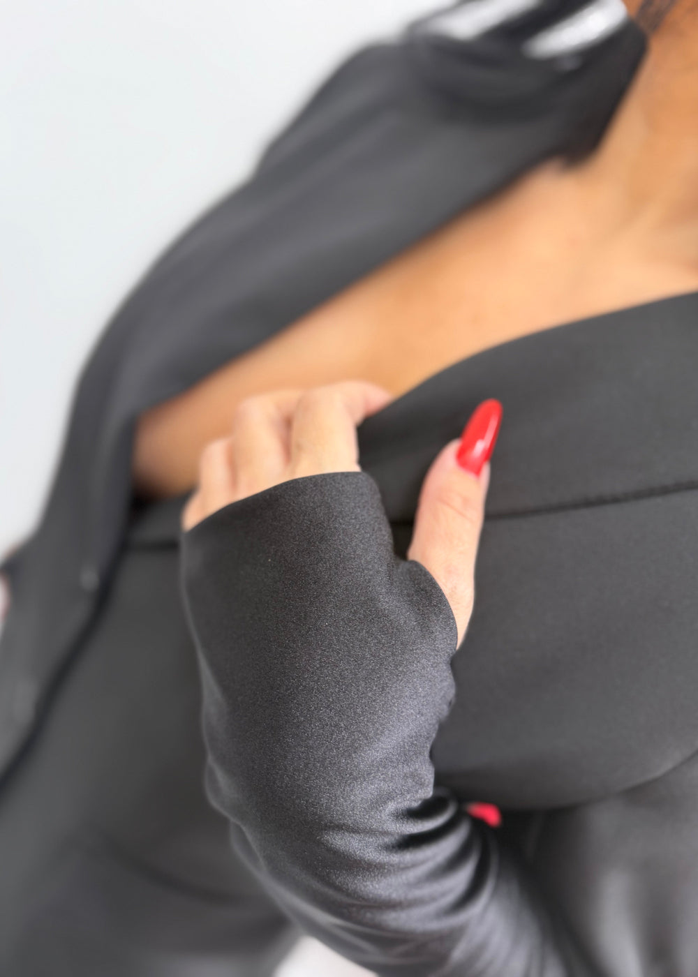 Feminin, modern și cu un aer couture, SIA Compleu Fundițe Iconic este setul care îmbină lejeritatea sacoului cu eleganța colanților modelatori. Sacoul are croială universală și este decorat cu fundițe maxi aplicate manual, creând un efect vizual de piesă exclusivă. Pantalonii tip colanți se mulează impecabil datorită materialului elastic dublat, modelând silueta și oferind confort total.