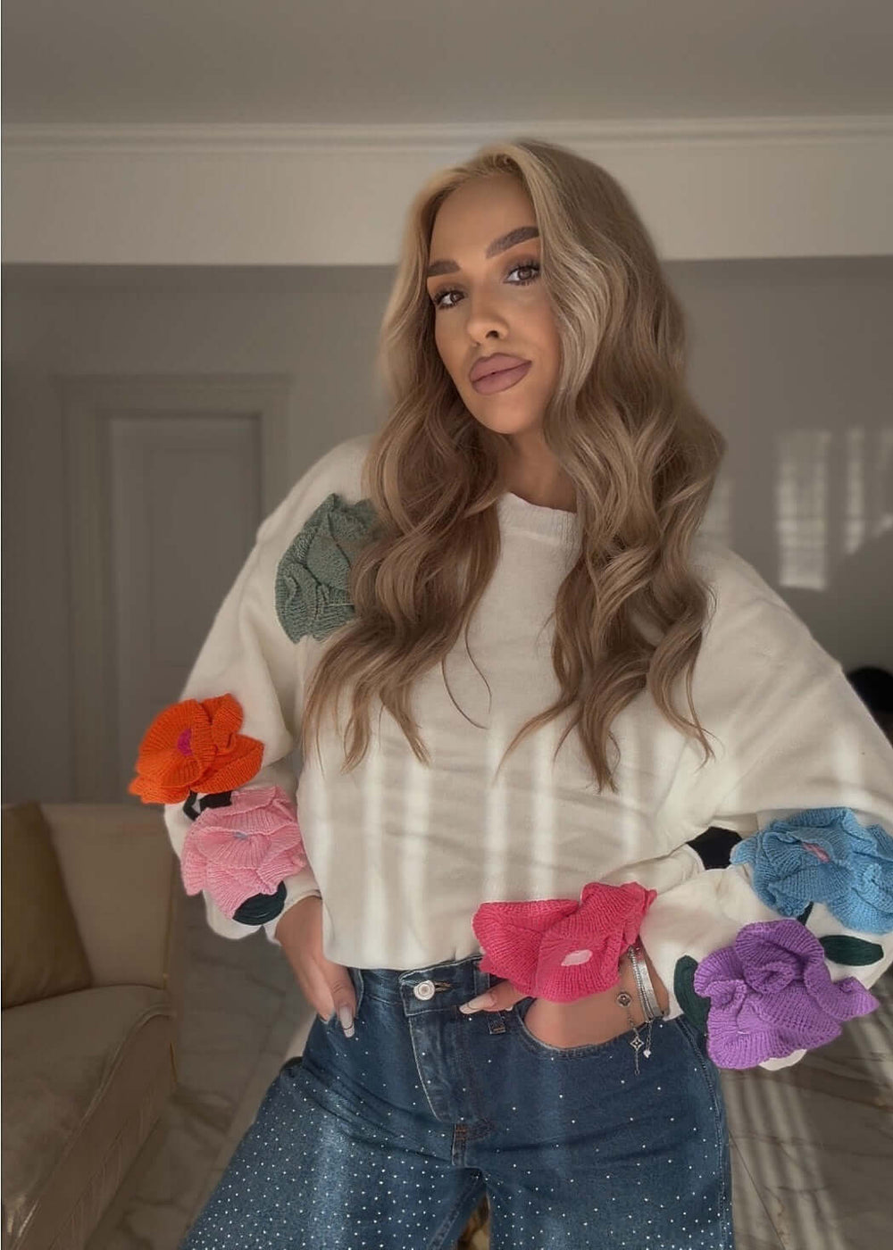 Realizat dintr-un tricot moale, plăcut pe piele, puloverul are o croială lejeră, modernă, ușor oversize, perfectă pentru ținute de zi confortabile, dar cu impact vizual. Detaliile florale 3D, realizate manual și aplicate pe mâneci și umeri, creează acel statement moment care atrage privirile, în timp ce baza alb-ivorie evidențiază superb culorile vibrante. Este piesa ideală pentru un vibe fresh, playful și unmistakably SIA.