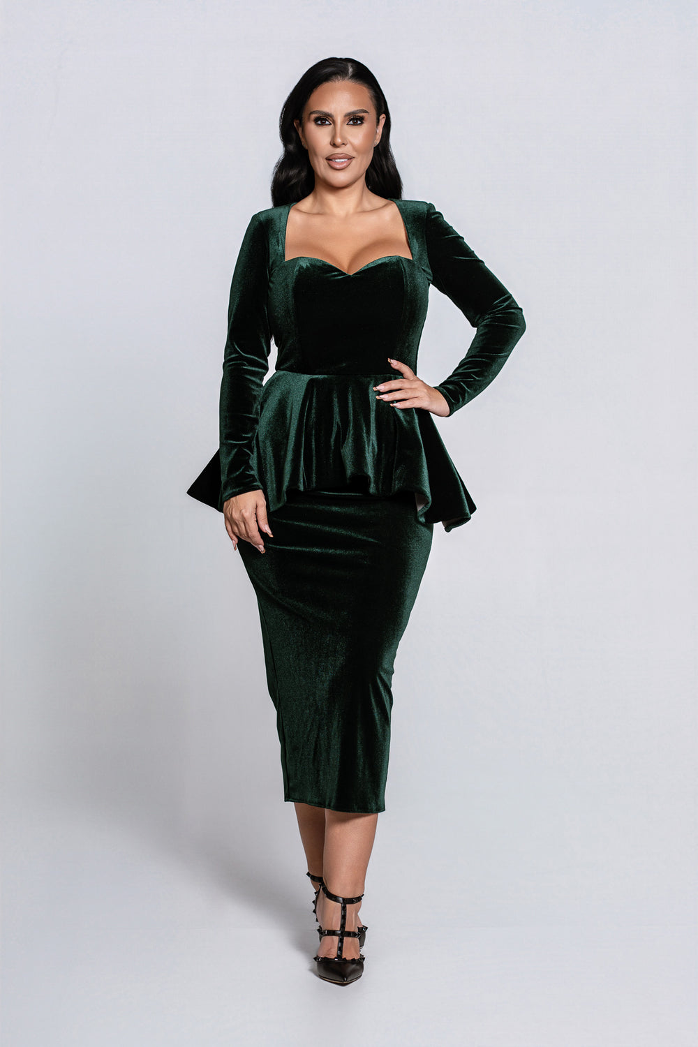 Croiala tip creion conturează delicat silueta, iar volanele ample din talie adaugă un plus de rafinament și originalitate.